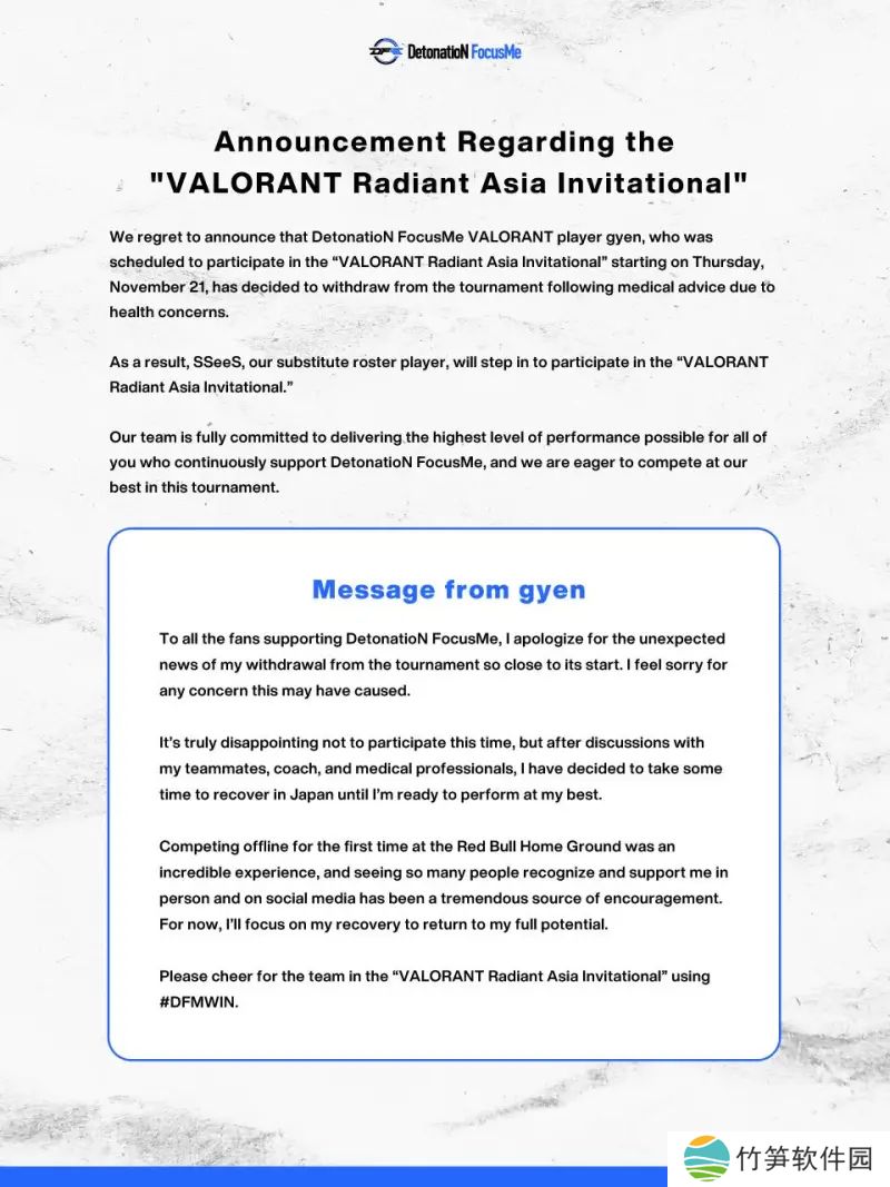 DFM官宣:gyen由于健康问题缺席源能邀请赛,由SSeeS顶替