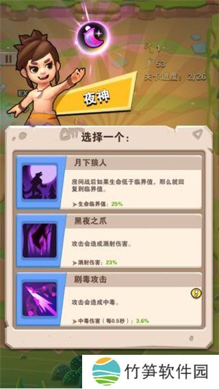 玩家初次开局只有一把弓箭,需要通过不断前进解锁更多技能,击败路上遇到的敌人完成闯关。