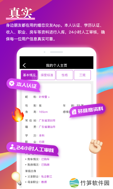 作为一个严肃找真爱的平台,铢铢App实行本人认证,所有用户都需要进行信息审核,通过后才能使用。平台还对用户的职业、收入、学历、户口、房车、三观、性格、兴趣爱好等**度信息进行入库,为用户提供学信网认证入口,杜绝虚假信息、广告骚扰和不良用户的存在。首创【免费婚恋模式】,让用户不受制于重重付费的关卡,在享有婚恋自由的同时还能拥有VIP级别细致周到的服务,让用户谈情说爱不为钱烦恼,是铢铢App坚守的初心和美好。