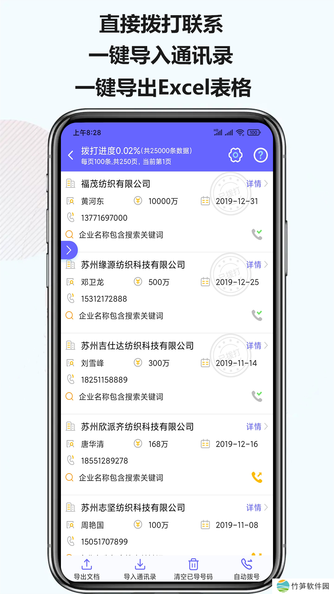软件内直接拨打联系商户,拨打进度统计标识,可导出Excel,可直接导入手机通讯录