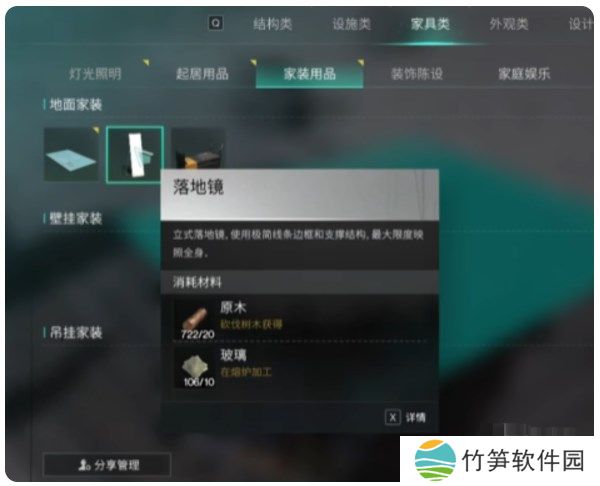 你需要消耗 20块木头 和 10块玻璃 材料来制作落地镜。完成制作后,落地镜将可以被使用。