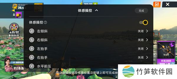 下滑找到“水平后压”,将虚拟按键放置在右下角的“抛竿”位置,然后开启该功能,点击完成。