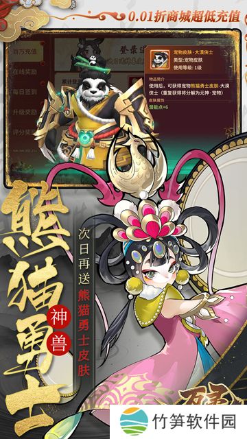 3、上线即赠变异神兽·熊猫勇士,连续登录更有好礼相送!次日得熊猫勇士皮肤,四日领绝版神装,七日获专属魂器,极品道具连续送不停!