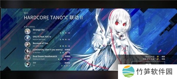 在设置中更换为Lanota的四个打击音类型和音符设计后,会自动进入隐藏曲的挑战解锁。可能大家会不太熟悉Lanota的音符按键,但是隐藏曲的解锁如同旋转音律本体的三个魔王曲的解锁一样,可以积累进度多打几遍来解锁。四、HARDCORE TANO*C联动II这一联动曲包的隐藏曲为Flashback Flicker