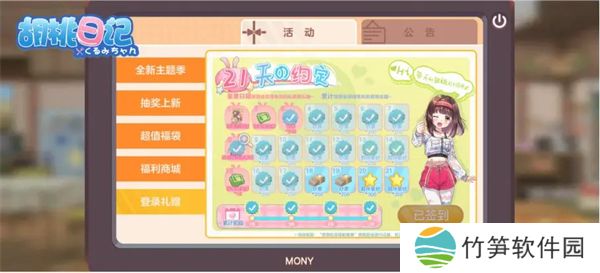 2、通过签到(戳电视机→登陆礼赠),在某些日子,本兔也准备钞票要送给桃子,千万别忘记每天和胡桃打招呼;
