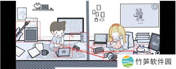 8、点两个人共同有的东西,包括两人的游戏机、吉他和耳机还有两只猫咪,除了3个物品外还有3个深层话题,需要连续滑动鼠标滚轮。