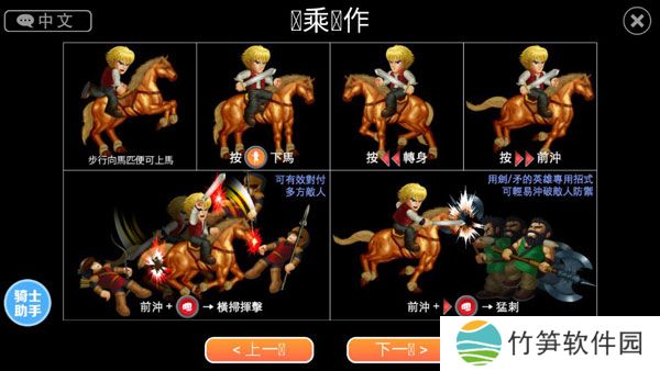 描述:当你骑乘坐骑时,通过上下方向键和攻击键的组合,可以释放骑乘相关的技能,例如抓取敌人或踢击。