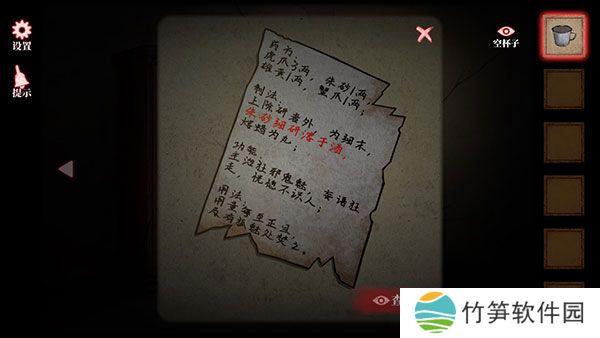 墙上的药方会告诉你需要将朱砂溶解于酒中,在房外你可以找到一坛酒,使用空杯子装酒来解决谜题。