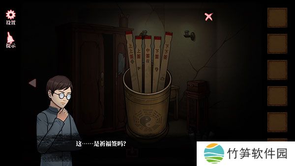 在柜子上有一个签盒,点击并摇晃签盒,会出现纸片。根据纸片上的信息,你将获得签盒中的五支签,上面会有关于匣子密码的线索。