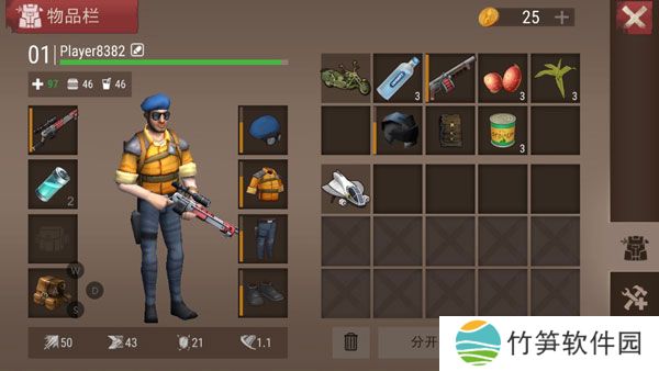 在人物界面中,你可以查看角色的各种信息,包括健康、饥饿、体力等。包裹界面则展示了你当前持有的物品,如食物、药品、武器等。