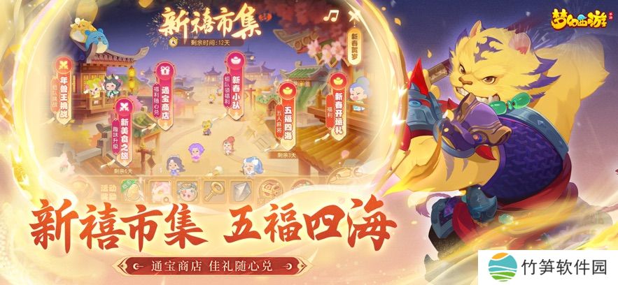 春节到,福利到!新禧市集全新上线!少侠化身新禧市集监造官,经营长安城 7 家商铺,将商铺等级从普通提升至金牌,每日经营产出建造基金和福蛇通宝。可使用福蛇通宝兑换珍贵坐骑小仙鱼、神兜兜、金钥匙、法宝精华。更有超级神蛇灵石惊喜掉落,解锁超强神宠,实力飙升!还有年兽王挑战组队出击,新服擂台竞技狂欢,五福珍宝惊喜连连,各种新春活动轮番上演,参与即享多重福利,丰厚奖励等你来拿,快来组队一同欢度新春!