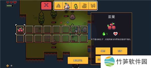 点击相应物品可查看详情,如:图示中的浆果下方的图标标明使用该物品后可恢复5点饥饿值和0点健康值