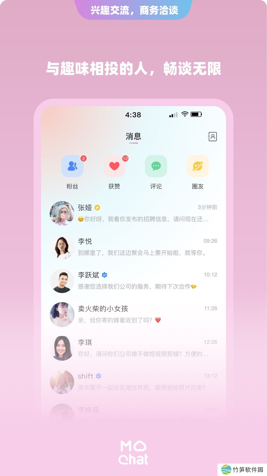 陌洽app是一个能自由交友的社交互动平台,里面有很多聊天室可以自由加入,通过平台你可以火速的扩大自己的朋友圈,结识到更多有趣的玩家。让你能轻松认识更多有相同爱好的朋友,大家可以在线放心交友互动,平台支持多种互动方式,能满足你的所有交友需求。