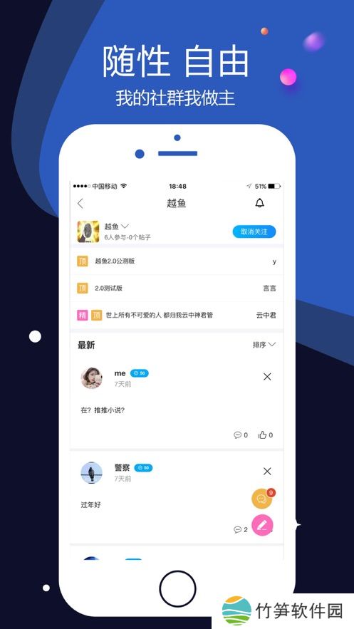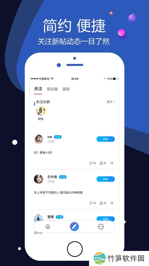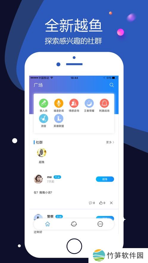 越鱼app功能· 社群: 交流兴趣和生活,结识新伙伴。