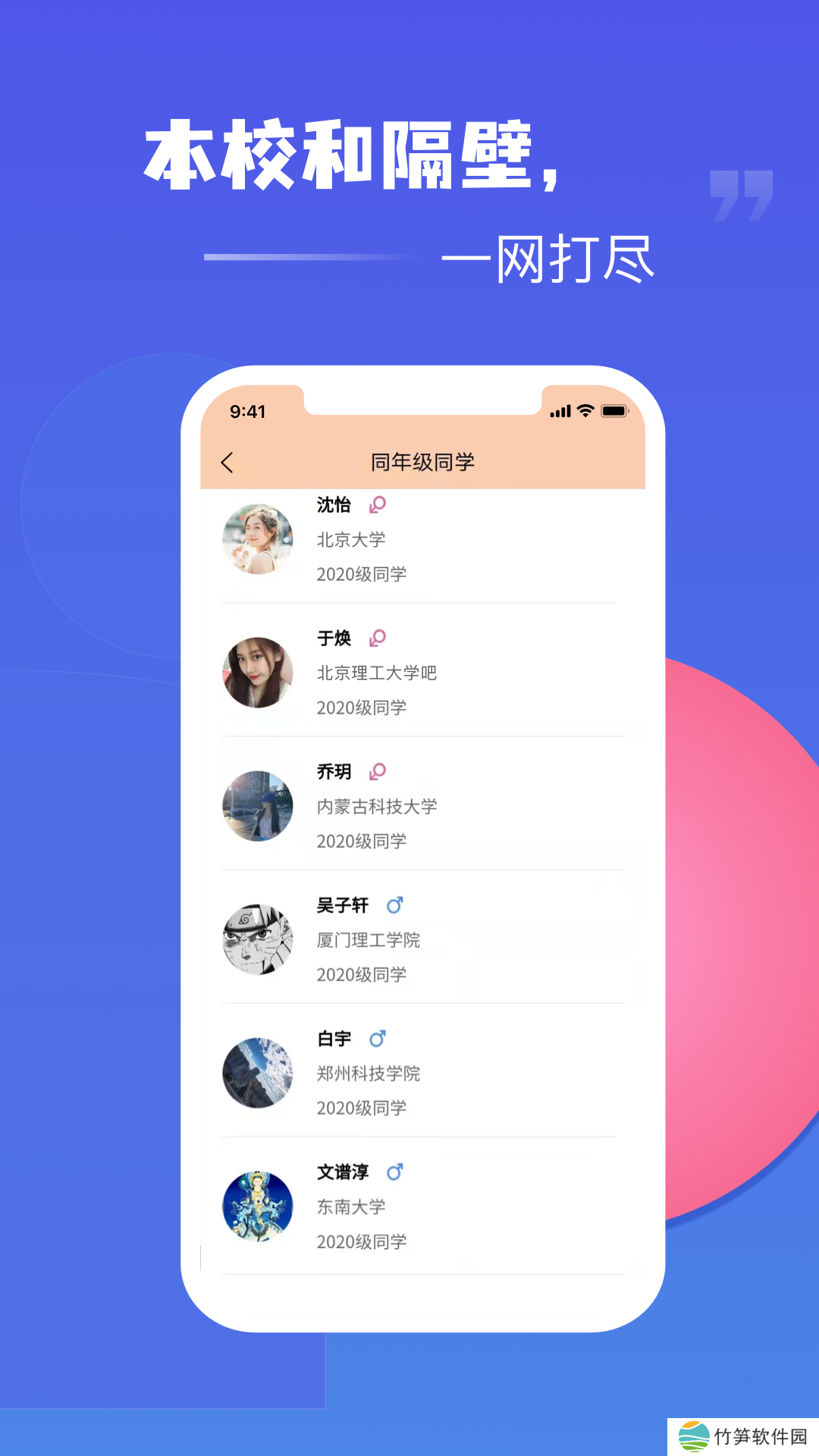 3、用户可以搜索自己学校的名字,认识更多的同学。任何学院都能认识。