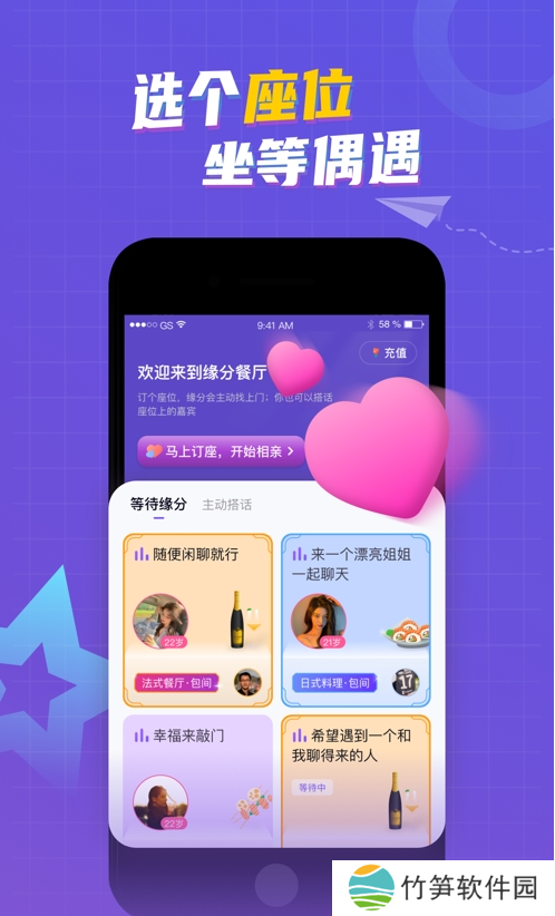 缘分餐厅app是一款非常有意思的交友平台,用户在app内可以预订一个虚拟座位,然后等待对方主动前来打招呼,如果聊得不错可以进一步发展成为恋人,心动不如行动,赶快下载试试吧!