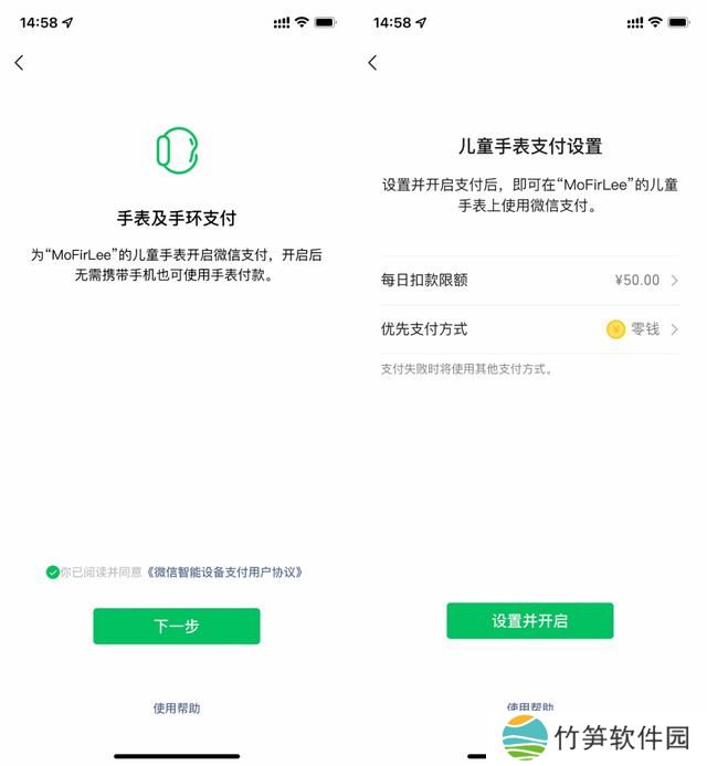 在管理员手机微信勾选你已阅读并同意《微信智能设备支付用户协议》,点击下一步,进入儿童手表支付设置界面。