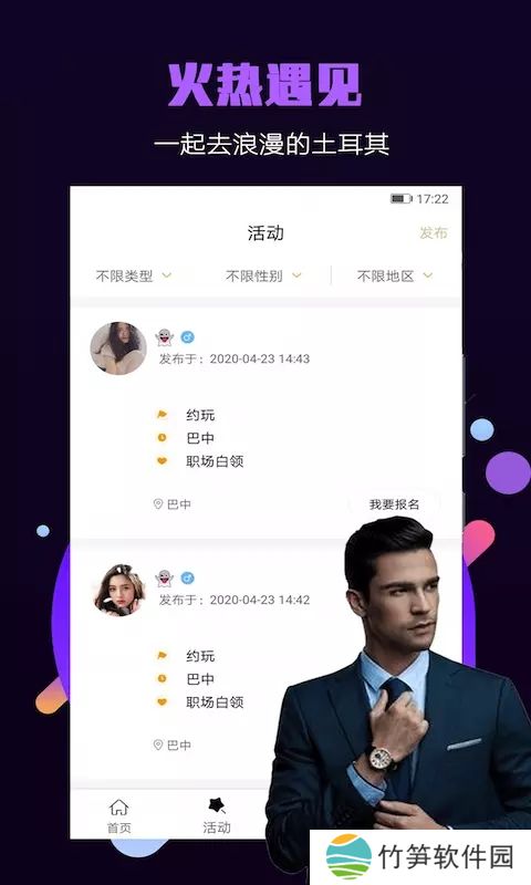 6、筛选活动,在这里可以通过类型、性别、地区来搜索活动信息;