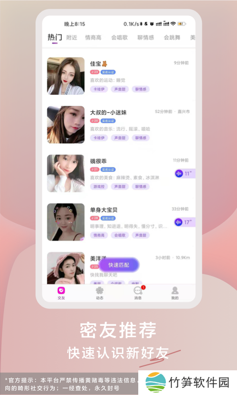 轻声app是一款最近很多人都在用的手机社交交友软件,此软件中你每天遇到很多好看的小哥哥小姐姐,每天都能为你显示附近可以约的人,这里的匹配速度很快,匹配的精准度也很高,保证配对的都是你感兴趣的类型,如果你有兴趣的话,不妨来007游戏网下载吧。