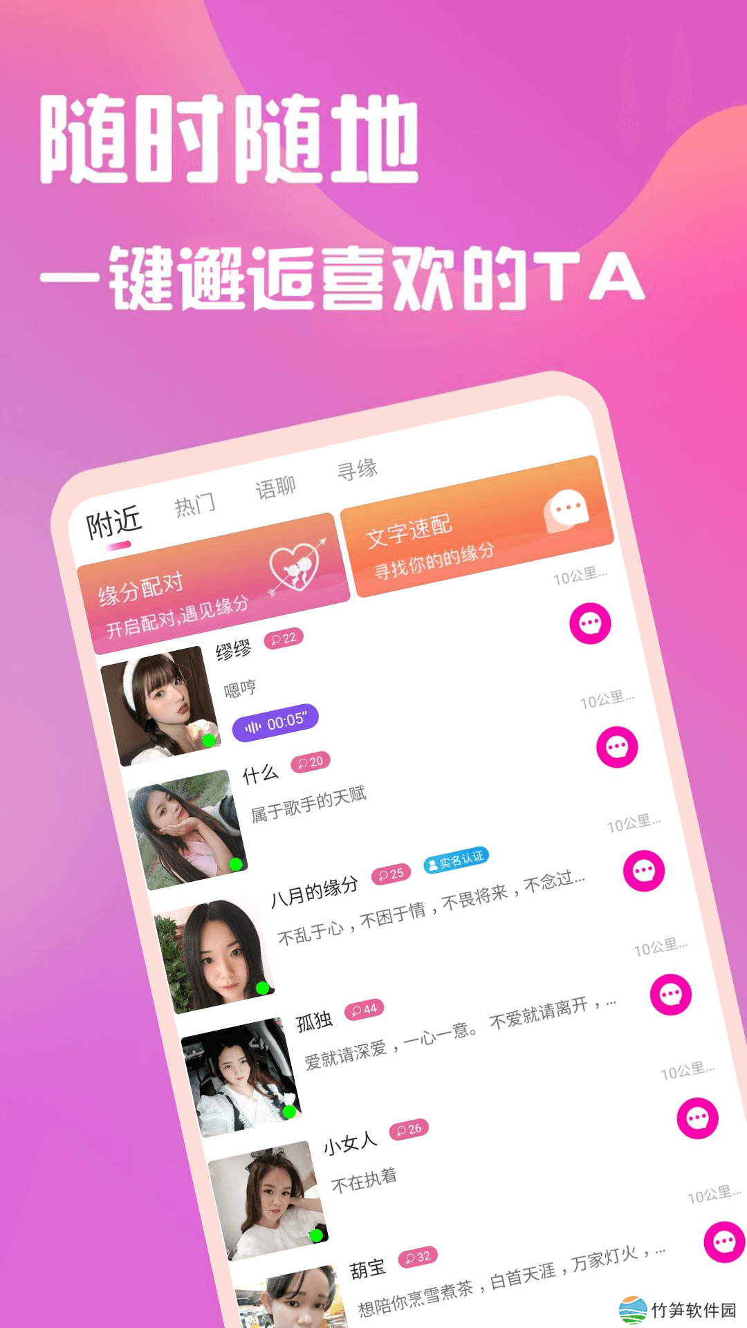 附近的语音聊天约会平台软件。这是一个一对一的语音聊天平台,将附近的人聚集在一起聊天、约会、交友、结交同城朋友以及在线社交网络。这是一款超级流行的一对一语音聊天和约会产品,在同一个城市拥有全新的免费聊天体验。