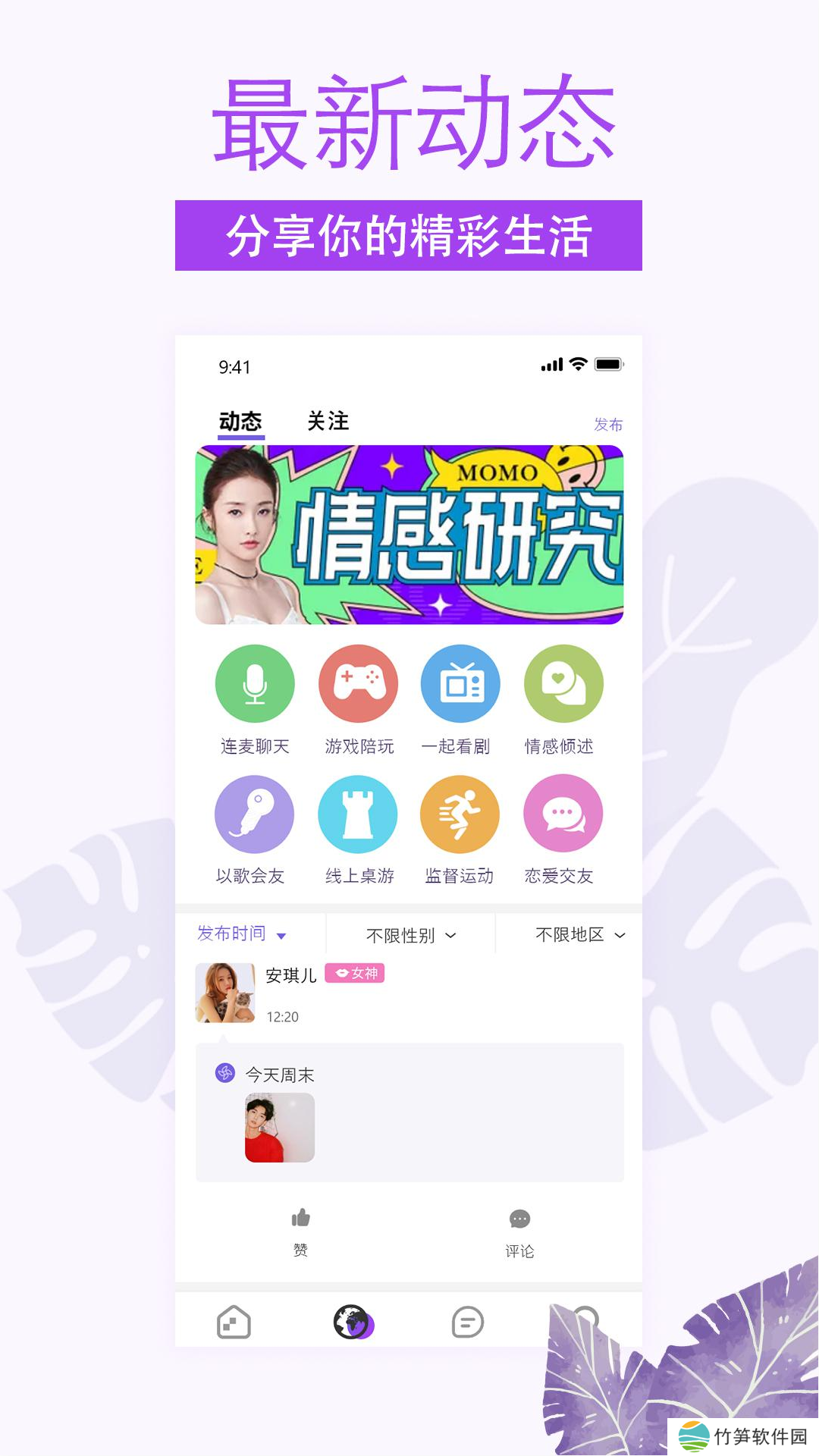 2、是一个单身恋爱交友软件、实时在线关注,喜欢动态的,在线互动没有任何限制;