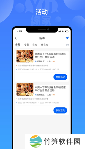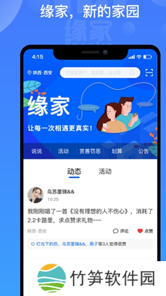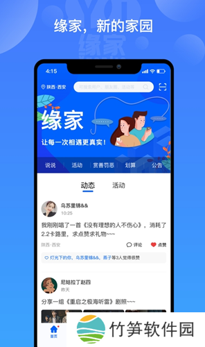 缘家app:一款最新更新的手机社交聊天软件,我们此款缘家app上面主要推出的就是社区交友,你可以在我们这里进行多种的活动都在等待你去了解,并且我们软件还可以让你在线的结交更多的朋友和小伙伴们,让你不再感到孤单和寂寞。你还在的等什么,喜欢的小伙伴们点击下载安装吧。