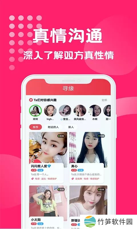 寻缘交友app:一款最新推出的手机社交聊天软件,我们此款寻缘交友app上面有着海量的高品质的在线用户和多种的在线的社交方式,能够在线的满足你的多种的手机社交的需求,并且我们搭载了最严格的真人视频审核的功能,能够让你在我们平台上面在在线的感受真人陌生人社交的快乐体验,感兴趣的来007游戏网下载。
