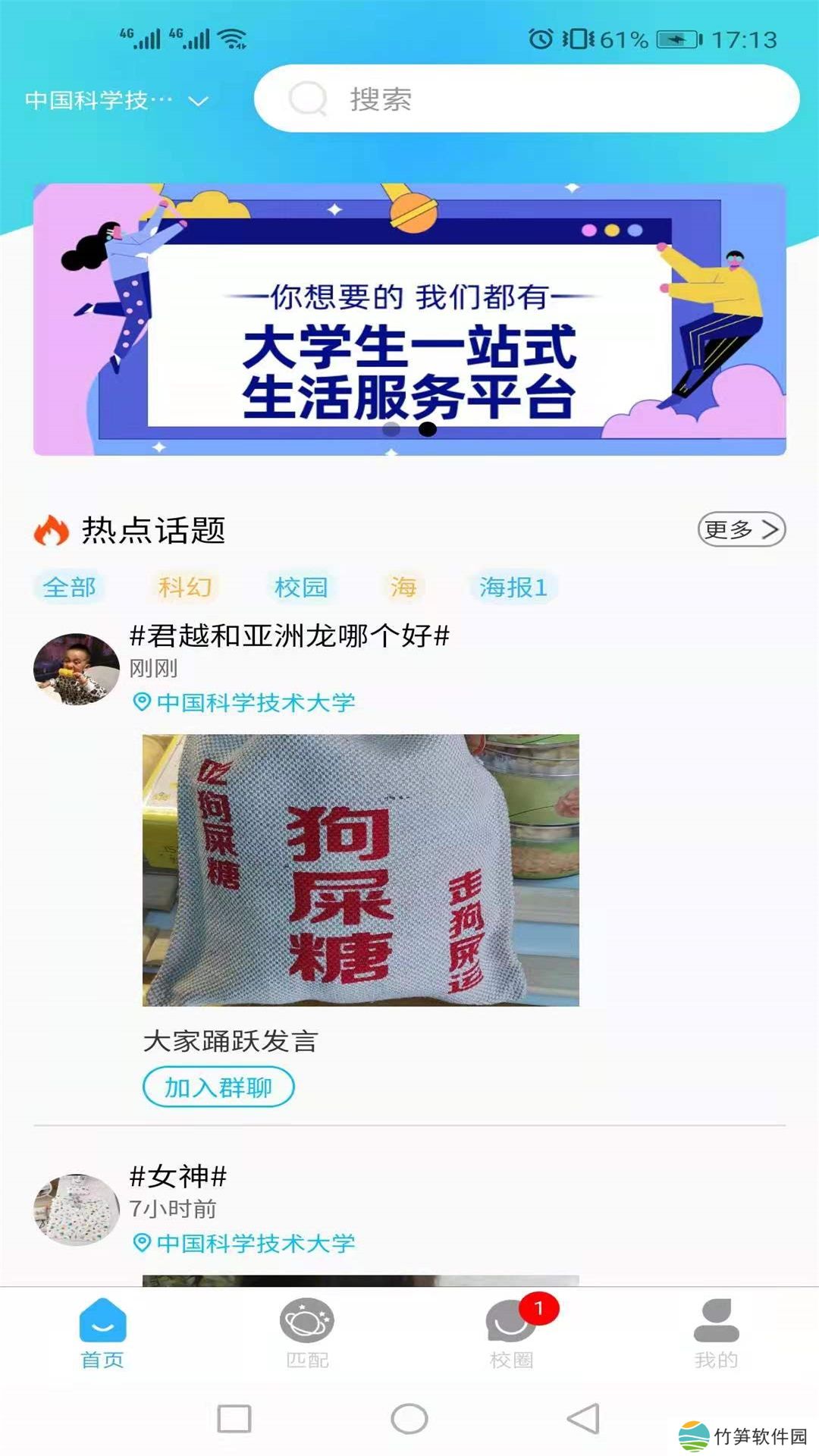 2、整合校园信息、实时热点话题圈、校园交友匹配、九折商城等,助力高校学子展现才华。