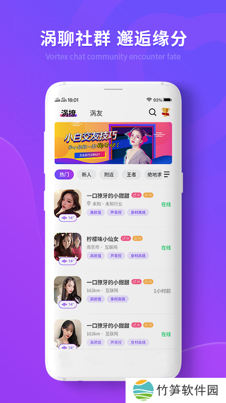 涡聊app优势交友:交友界面展示最新上线的附近的异性,看到自己喜欢可以打招呼!