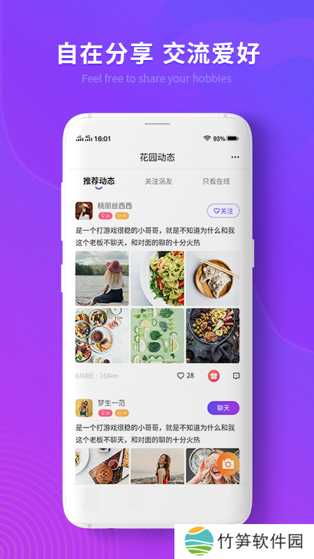 花园:展示推荐好友的动态或者你也可以发布自己的动态展示给好友看,类似于朋友圈!