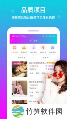 按个摩app功能1、上门服务:可以根据自己的身体情况,选择适合的按摩项目,查看项目介绍,可以筛选服务商,按销量排序,按评价排序,按好评排序