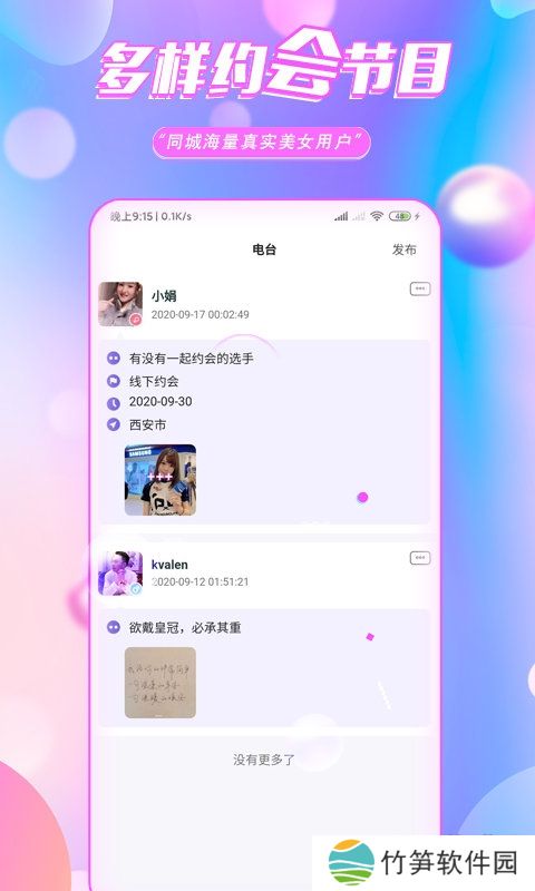 丰富的约会节目: 发布看电影、吃吃喝喝、玩游戏、运动、旅游等约会节目的广播,清晰直接高效