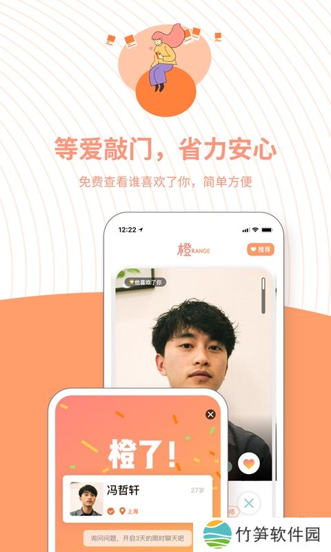 「橙App」每天为你推荐合拍对象,男生表达好感,女生接收信号;开启三日聊天,过滤低效对话,找到聊得来的TA;资料真实,态度真诚,交换微信或约定见面,让网恋可以奔现。