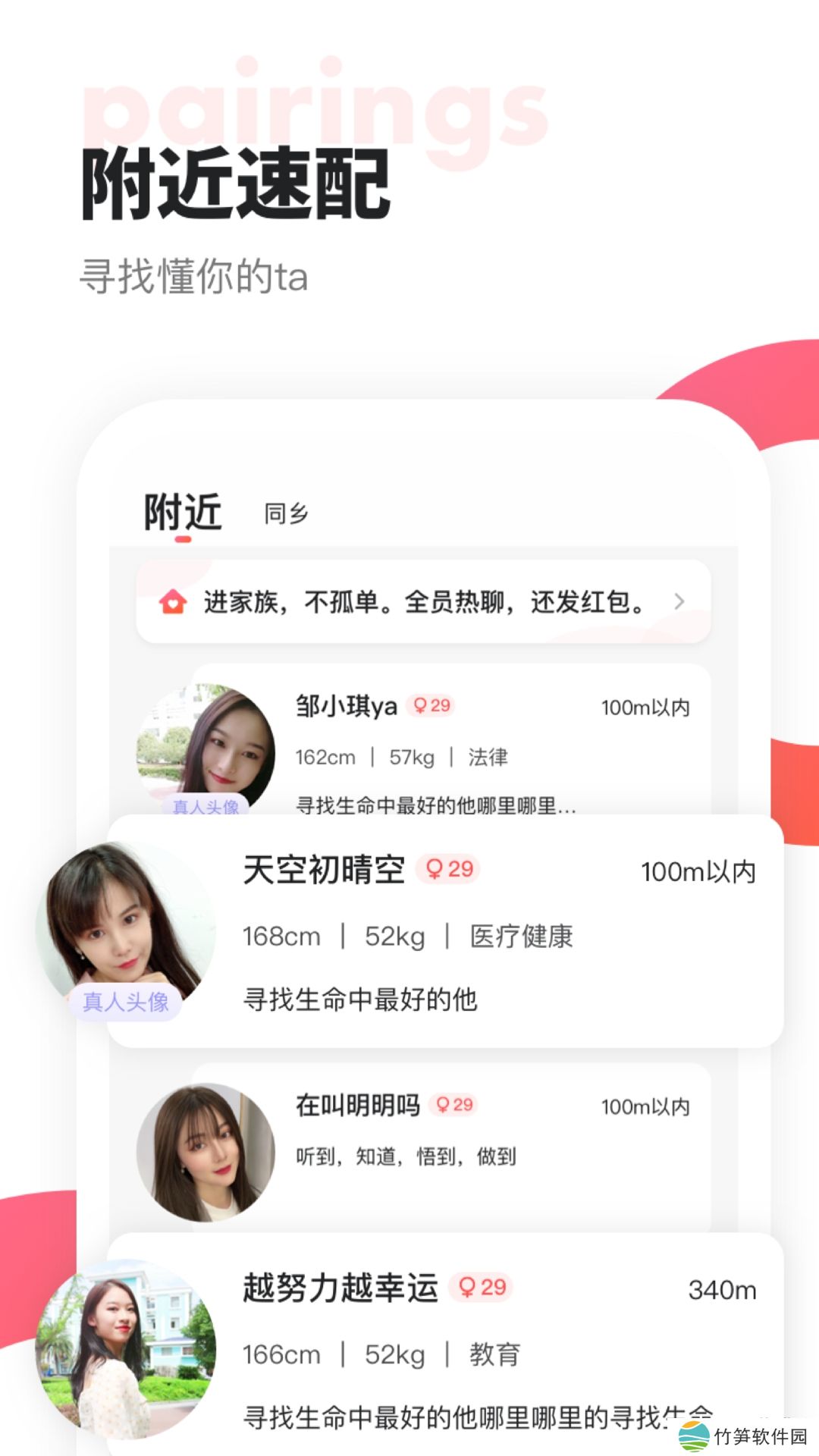 根据你的喜好,为你推荐附近、同乡、同城更合适的人;因为合适,所以聊得来,真人社交,快速脱单。