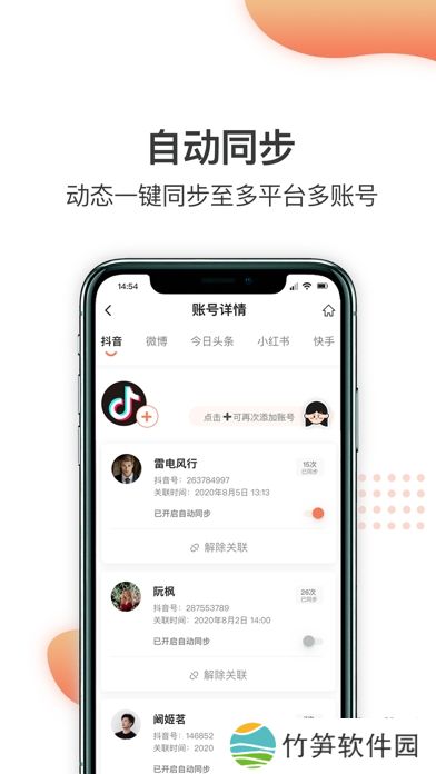 朋友圈同步神器app一键转发版下载用法:1.打开同步神器APP,在关联界面添加关联帐号。