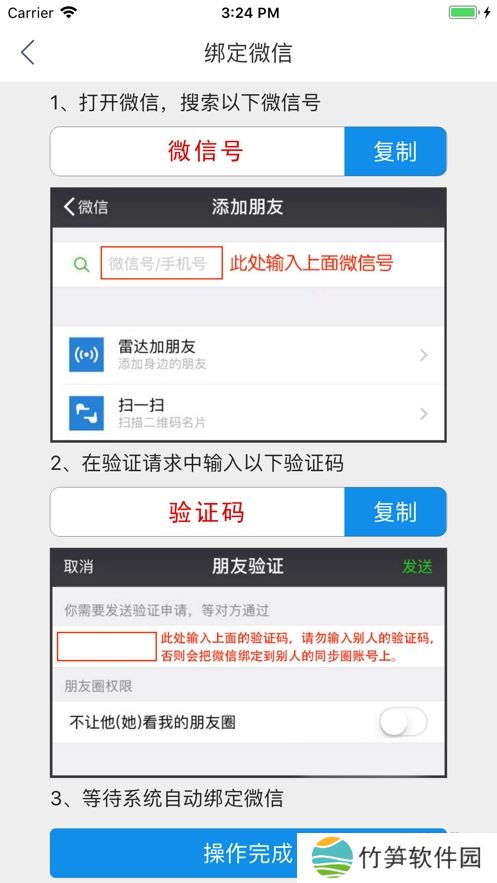 2.绑定微信,添加同步神器为微信好友,在验证申请中输入验证码,成功添加好友后点击确认绑定。