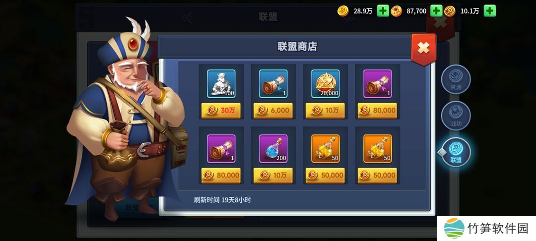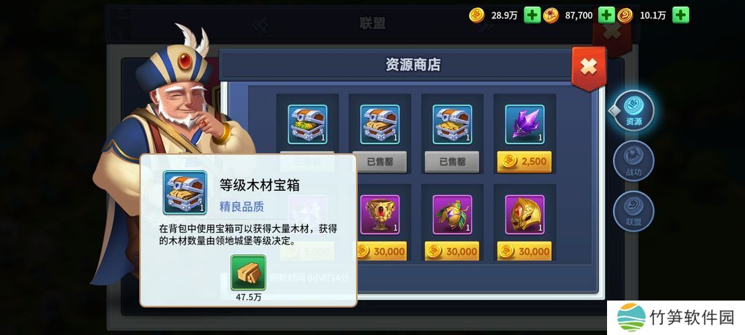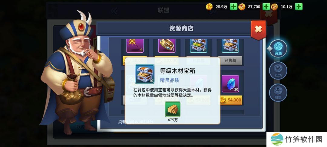 7、联盟玩法,联盟解锁以后加入一个适当好一点的联盟,联盟是前期获得木头的主要来源,每天几百万木头。联盟战争选择那些你能打的过的,那种24小时看看收益,收益高的打,打完选择掠夺不要占领。每天可以打5次,贵族等级高了会增加次数。打完在联盟商店买资源,每天必买木头。别的都不要,如果比较富裕可以适当买一些别的东西,自己把握。