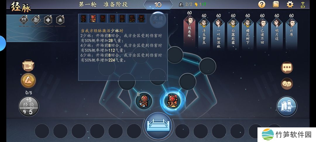 @左下角是升经脉等级,升一级可以多上场一张牌。用右上角的玉升级经脉经验,五个玉可以点一次让这个经验数字加五,比如图里点一次花五个玉加五个经验把0/5变成5/5升一级。每打一次架结束也会自动加静脉经验。