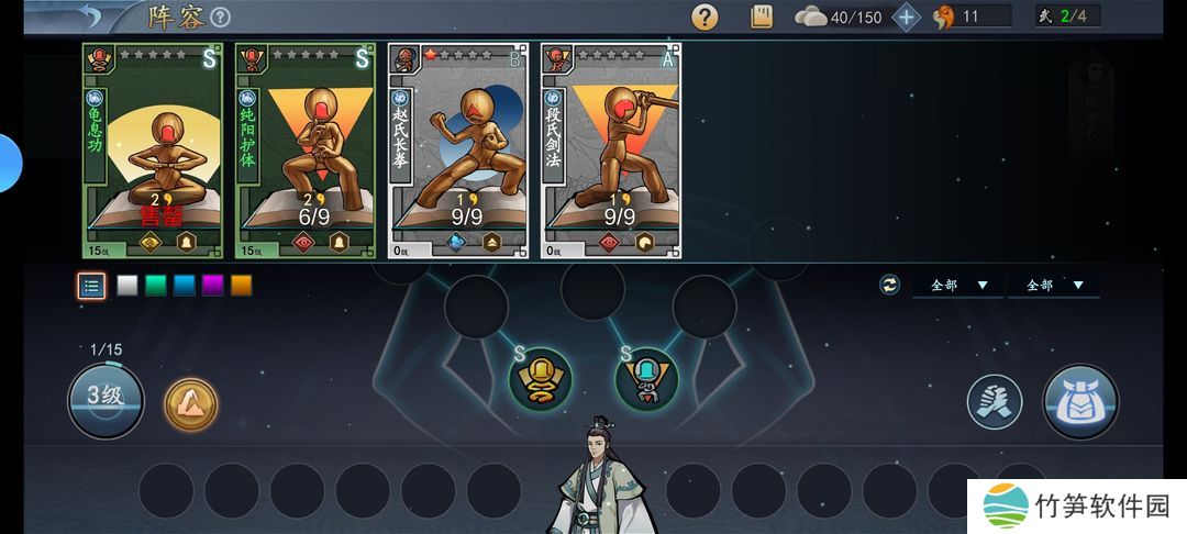 @比如我抽到的纯阳护体被我养到15级,它的属性就高点。左下角显示它是15级,别的我没有的就显示是0级