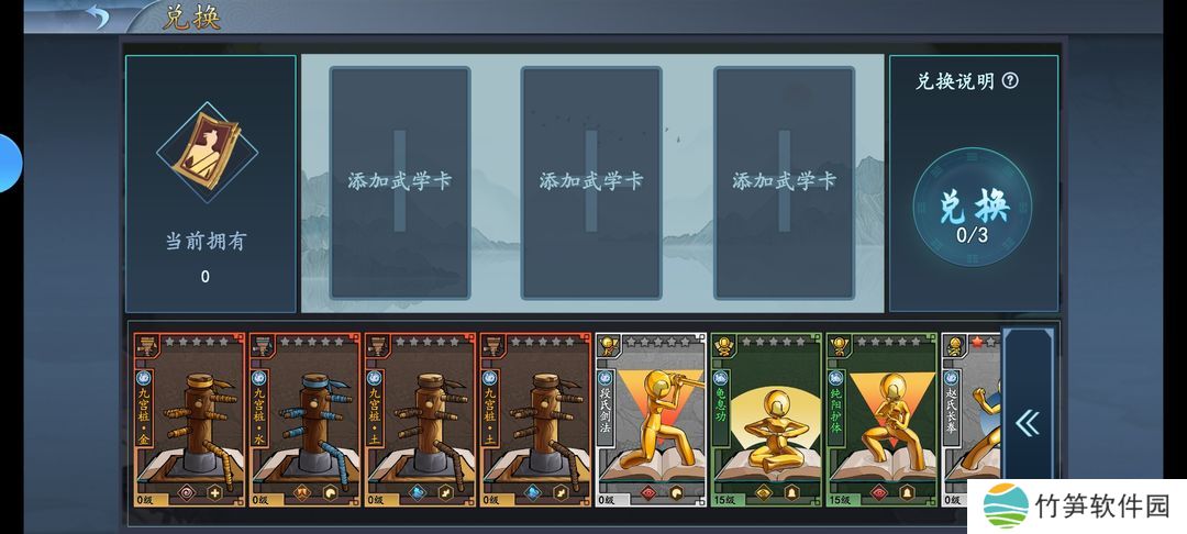 @右下角可以看卡池里具体有啥。目前卡池出 武学 和 桩子 两种卡,桩子不能打架,除了金桩子攒三个一样的换三合一卡券,其它都换成经验给武学卡升级。