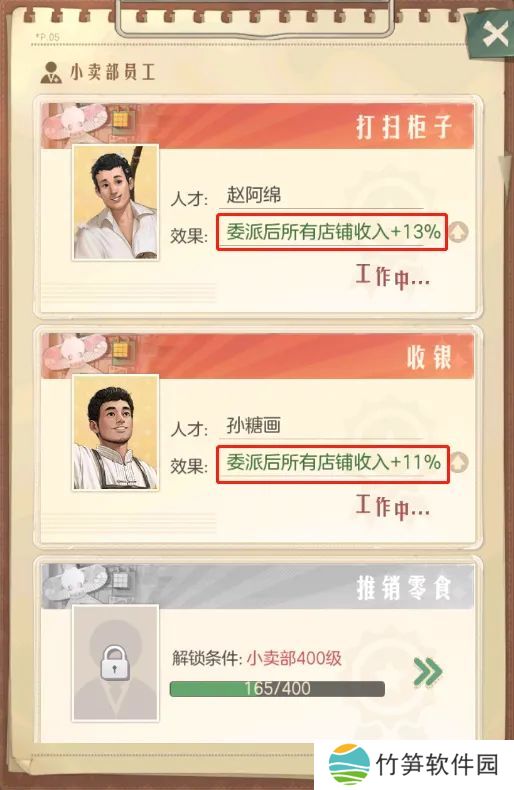 不管是高等级的人才还是低等级的人才,一经委派,则所有店铺收入统一加成。