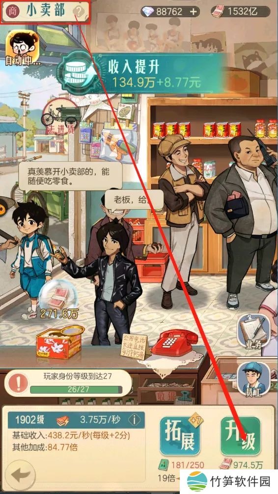 为小卖部和早餐摊是最先开设的,在同等等级下,初始店铺升级的所需钞票较少,相较后面开设的店铺而言,划算便宜大碗,所以我们可以选择其中一个作为优先升级的店铺。