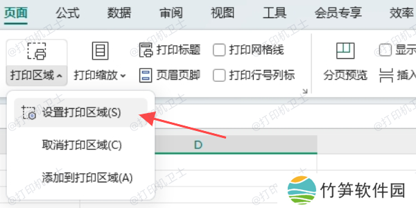 在顶部菜单栏中点击 “页面布局”>“打印区域”>“设置打印区域”。