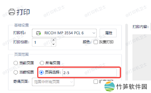 在 “页面范围” 选项中,选择 “页面选择”,手动输入想要打印的页码(如 2-5)。