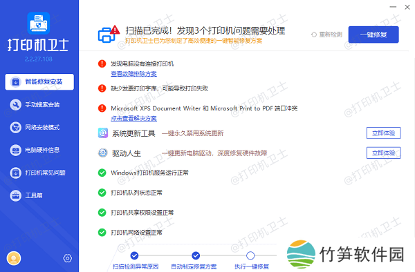 2. 如果显示打印机问题需要处理,点击“一键修复”。