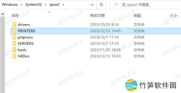 3、打开文件资源管理器,进入 C:WindowsSystem32spoolPRINTERS 文件夹。删除其中的所有文件,这些文件是打印任务缓存。