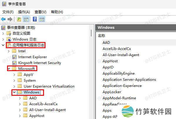 依次展开 “应用程序和服务日志” → “Microsoft” → “Windows” → “PrintService” → “Admin”或“操作”。