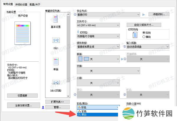 在“彩色/黑白”选项卡中,确保选择了正确的纸张类型和打印模式,如“黑白”或“彩色”。