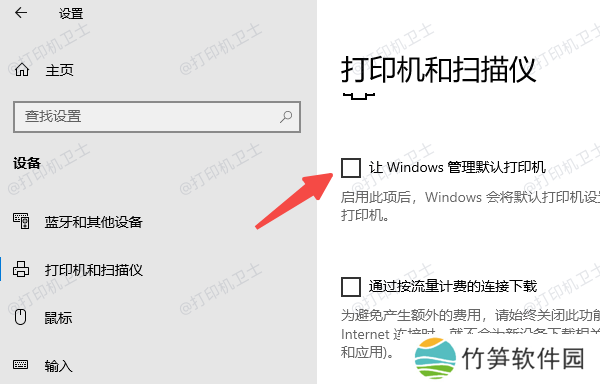 在右侧找到“让Windows管理默认打印机”,如果该选项已开启,请将其关闭。