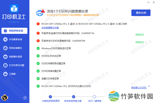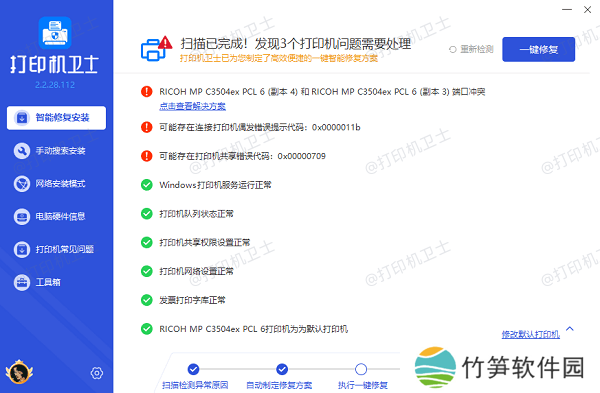 在检测结果中,如果检测到共享打印机709错误代码,点击“一键修复”按钮自动进行修复。